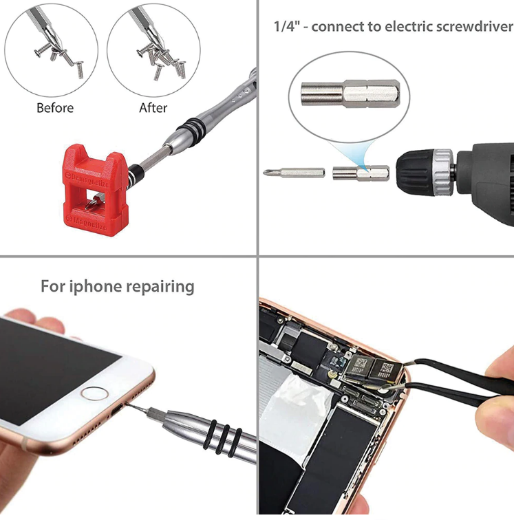 Screwdriver Specification: PH000, PH000, PH00, PH00, PH0, PH0, PH1, PH1, PH2, and PH2 M, word, PZO, PZO, PZ1, PZ1, PZ2, and PZ2 Straight: 1.0, 1.5, 2.0, 2.5, 3.0, 3.5 and 4.0 Straight: 1/16, 5/64, 3/32, 7/64, 1/8, 9/64 and 5/32 Five Stars: 0.8, 0.8, 1.2, 1.2, 1.5, 1.5, 2.0 and 2.0 Torx: T3, T3, T4, T4, T5, T5, T6, T6, T7, T7, T8, T8, T9, T9, T10, T10, T15, T15, T20, and T20 Hexagon: 07, 0.9, 13, 1.3, 1.5, 1.5, 2.0, 2.0, Z5, 2.5, 3.0, 3.0, 3.5, 4, 0 and 4.0 Hexagon: 1/16, 5/64, 3/32, 7/64, 1/8, 9/64 and 5/32 Triangle: 2.0, 2.3, 2.7 and 3.0 "U" form: 2.6 and 2.6 "Y" shape: 2.0 and 3.0 4mm socket: M2.5, M3.0, M3.5, M4.0, M4.0, M4.5, M5.0 and M5.5 Package Include: 1* aluminum alloy handle 1* extension bar 1* short bar 1*tweezer 1*SIM card pin 1*magnetiser/demagnetizer 1*sucker 1*pry piece 2* crowbar 90*screwdriver bits